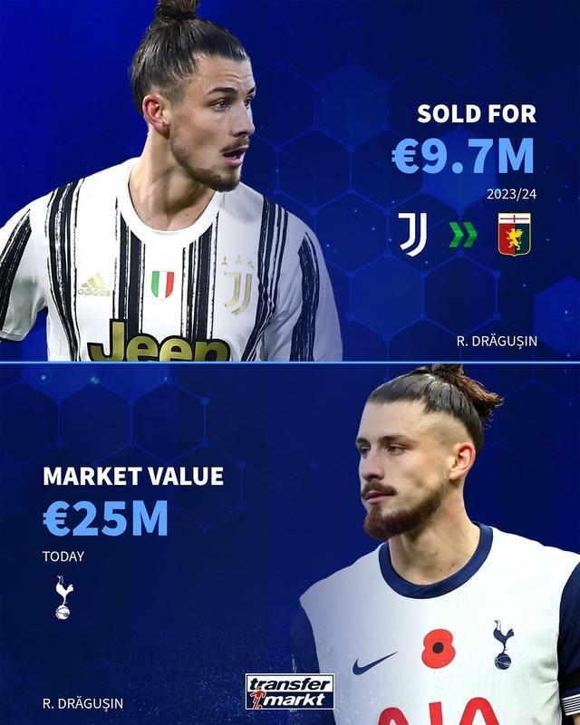 德拉古辛 23-24赛季转会费970万欧→目前身价2500万欧